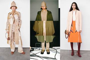 ウィメンズ向けの商品の目玉はトレンチコート。ビブ(胸当て)のような形にデザインされたものや、ベージュとニュートラルカラーのパッチワークをあしらったもののほか、ケープのディディールを取り入れたソフトフォーンおよびディープファーングリーンカラーのトロピカルギャバジン素材のカーコートがお目見えした。