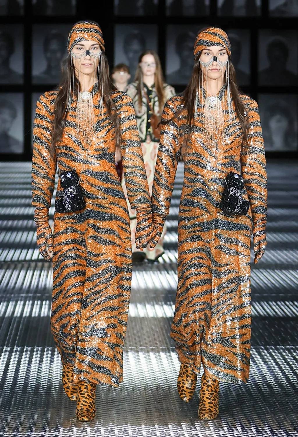 さらに「グッチ(GUCCI)」のショーでは、そっくりすぎる双子のモデル、ジェイク&ジョシー・デュポンが眩いオレンジとグレイのゼブラ柄のマキシドレスで登場した。