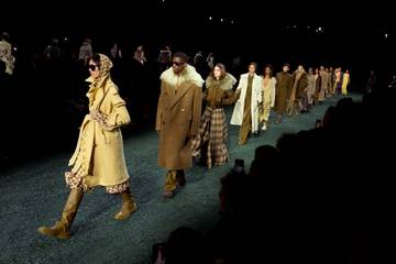 舞台は、巨大なサーカス風テントのなかに現れた、芝生のキャットウォーク。ダニエル・リー(Daniel Lee)クリエイティブディレクターは今回もアウトドアと自然とのつながり、および、英国とアイルランドの風景や人々から得たインスピレーションを踏襲。2024年秋冬シーズンに向け、モールスキンを使ったシグネチャーのトレンチコートやダッフルコート、フィールドジャケットなど、寒さから身を守る丈夫で暖かなアウターウェアを中心としたエレガントで洗練されたコレクションを披露した。