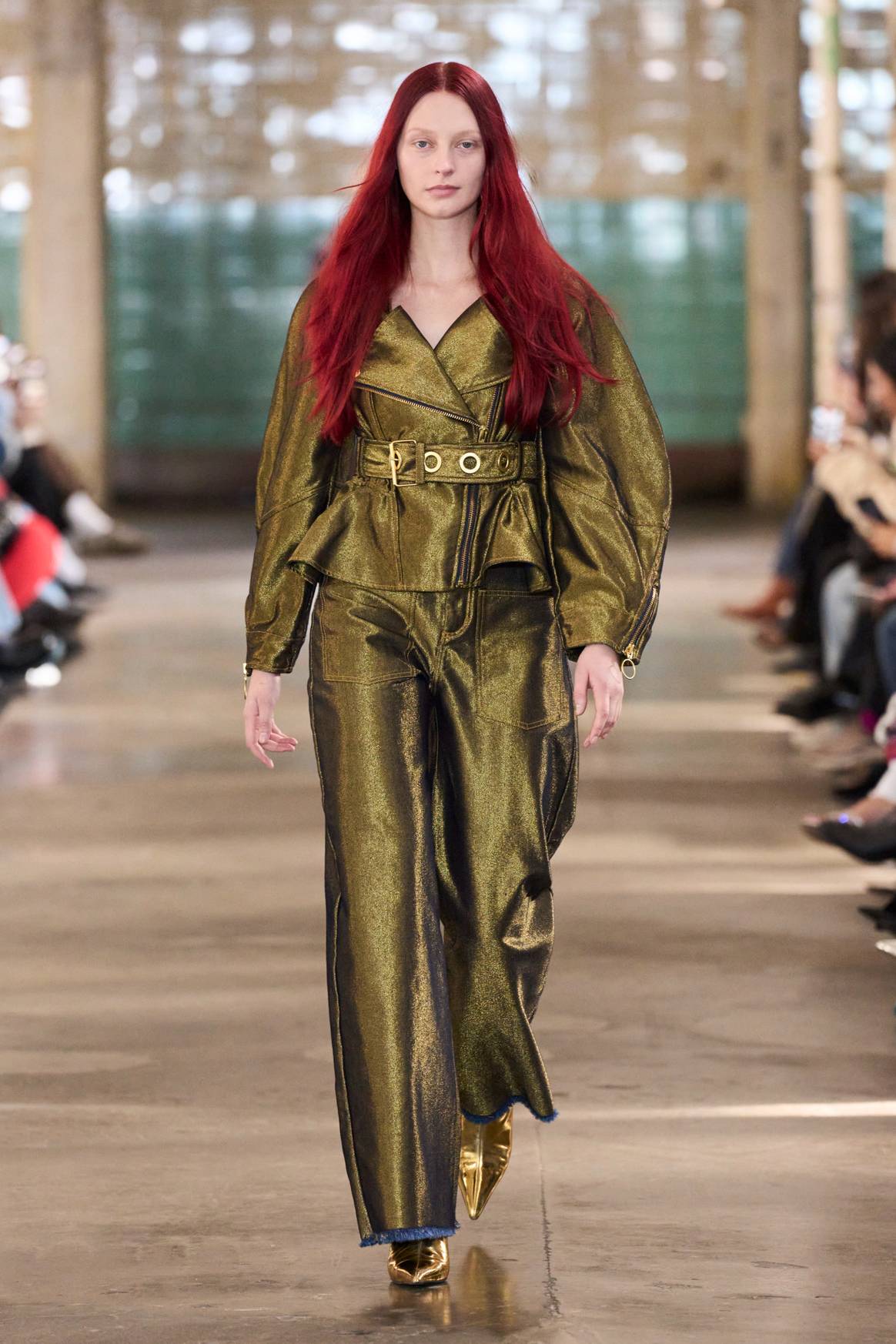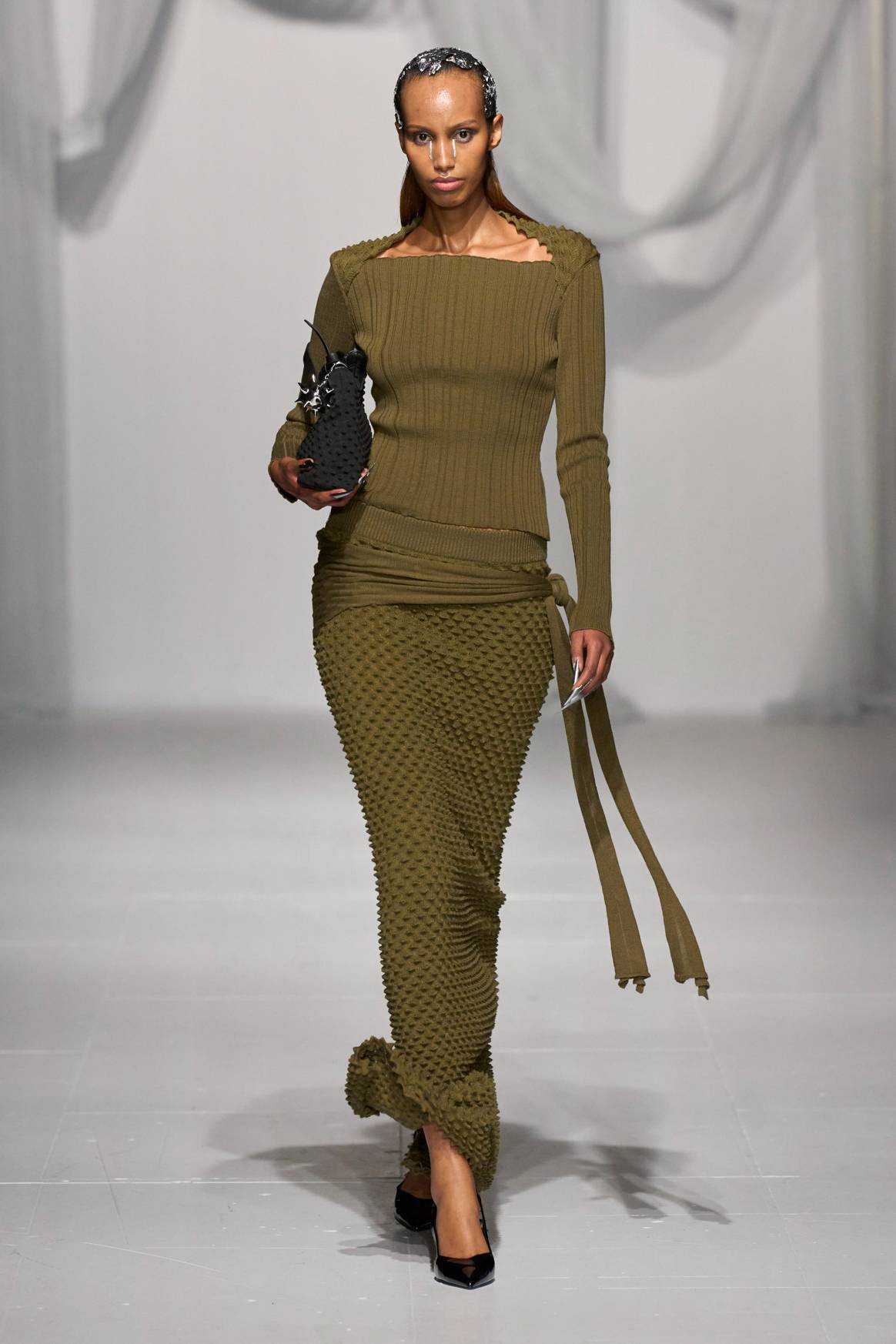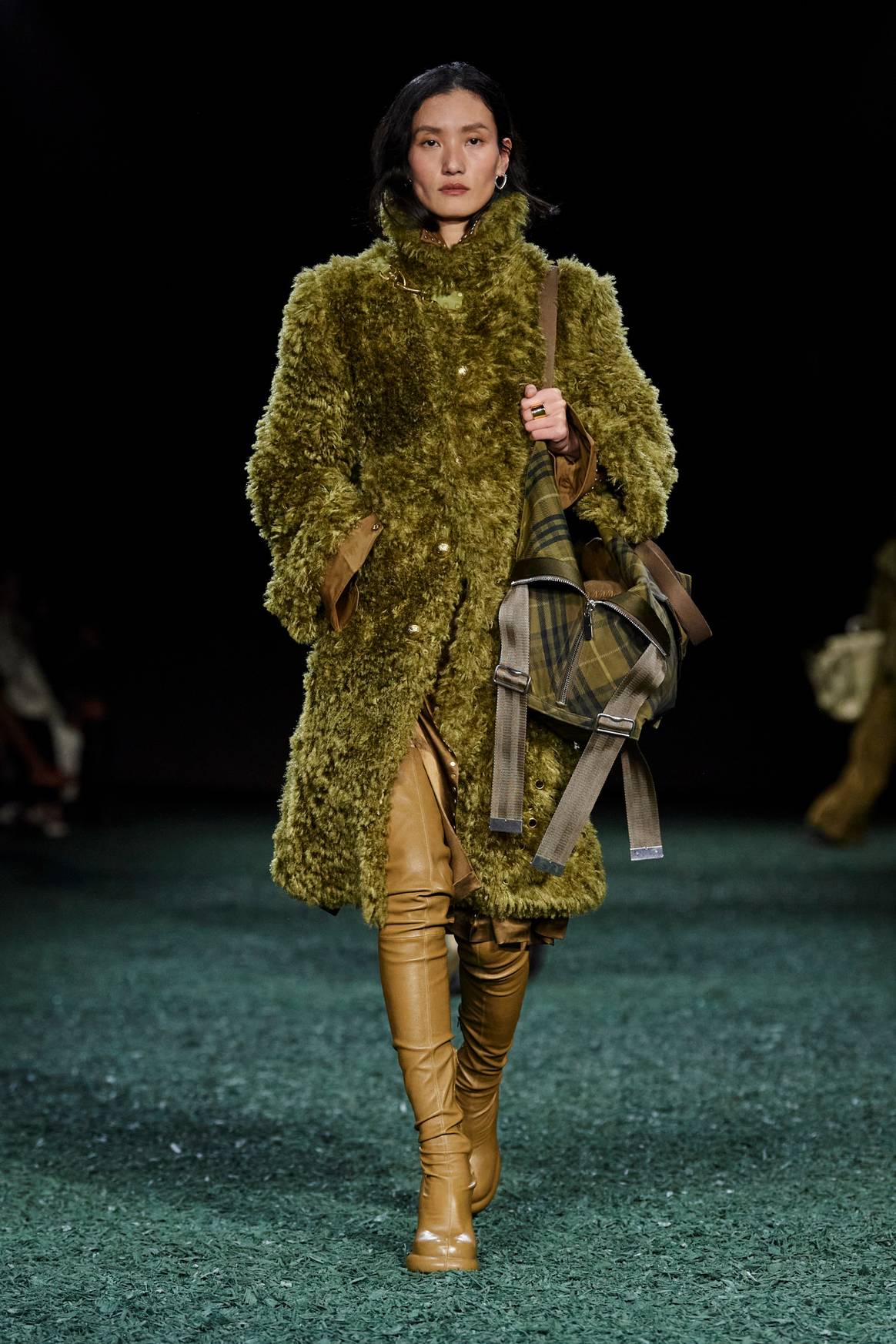 「バーバリー(BURBERRY)」のダニエル・リー(Daniel Lee)はイースト・ロンドンのヴィクトリア・パークに建てられたテントでショーを開催。英国で軍や探検隊に防寒や防水といった天候に強い衣料を提供してきたブランドのヘリテージに対するメッセージとして、全体的にオリーブグリーンを使ったコレクションを披露した。1868年に初めて英軍服に使われたオリーブグリーンは、以来ミリタリールックの定番カラーになったが、近年では強さやリジリエンス、地球や自然とのつながりを表現する色としてさまざまなアイテムに取り入れられている。おそらく今季のロンドンでもオリーブグリーンが多くお目見えしているのはその理由からといっても過言ではないだろう。