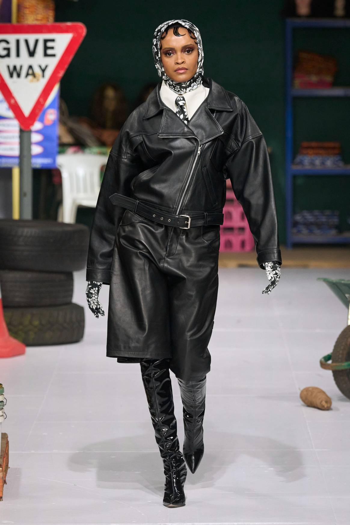 ブラック・レザーは、ライダー・ギャング同士の抗争を描いた1953年公開の映画『乱暴者(あばれもの)』でマーロン・ブランド役の主人公が黒い革ジャンを着ていたことでワルな若者のシンボルと称されるようになった。だが今日、女性のブラック・レザー(パテントレザーを含む)のルックスは、エンパワメントとセクシーさを強く表現するファッションアイテムである。ランウェイでも毎年世界中でよく手を変え品を変えて登場する黒革ルックスは、もちろん今回のロンドンでも健在だ。